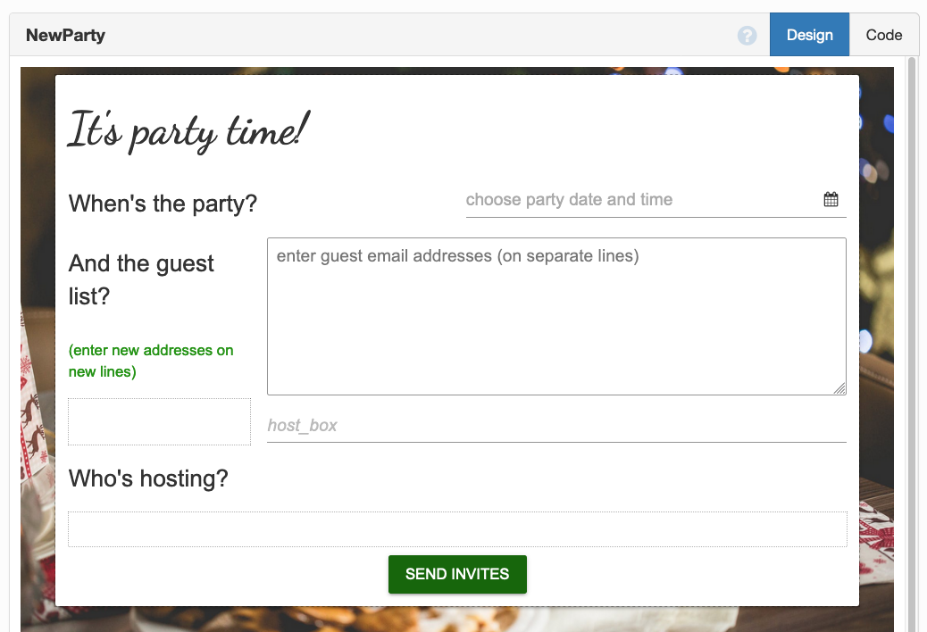 self.content_panel.add_component(NewParty())We’ve marked our send_invites server function as @anvil.server.callable so we can call it from our client-side code. From our NewParty Form, we call the send_invites function and pass on our user’s inputs when the ‘Send Invites’ button is clicked:
