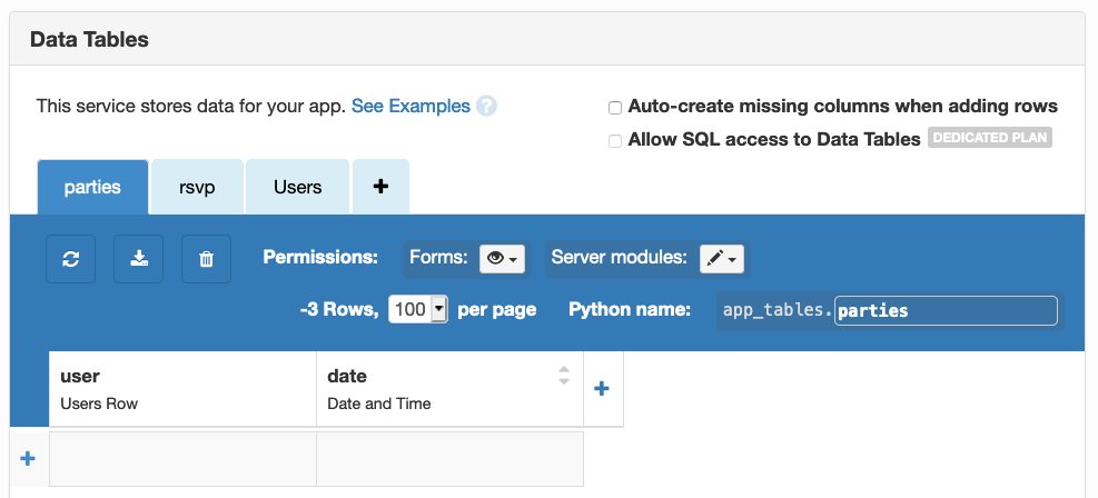 We’re also using Anvil’s Data Tables to store our parties and rsvps, and our tables look like this: