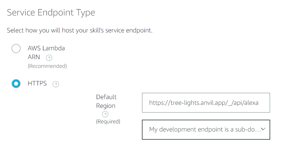 Firstly, you’ll need an Amazon Alexa device of some description. She hides in everything these days, so you’ve probably already got one - here’s a good way to find out. Make sure the device is registered to your Amazon account, then head to the Alexa Developer Console and create a new Skill. I called mine remote-christmas-tree.
