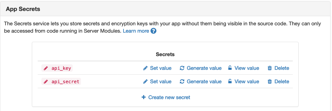 We’ll use the Vonage API to send our text messages. You’ll need to create a Vonage account to get your api_key and api_secret. Once you have these, use Anvil’s App Secrets to store these, encrypted, in your app:
