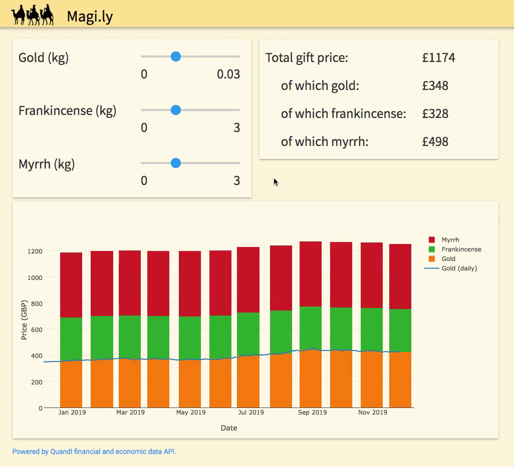 That’s why it’s easy to get the ‘price of gold’ over time, but no API endpoint for frankincense or myrrh. We pull the historical record of this data, which you can use to decide when to buy your Christmas gold.