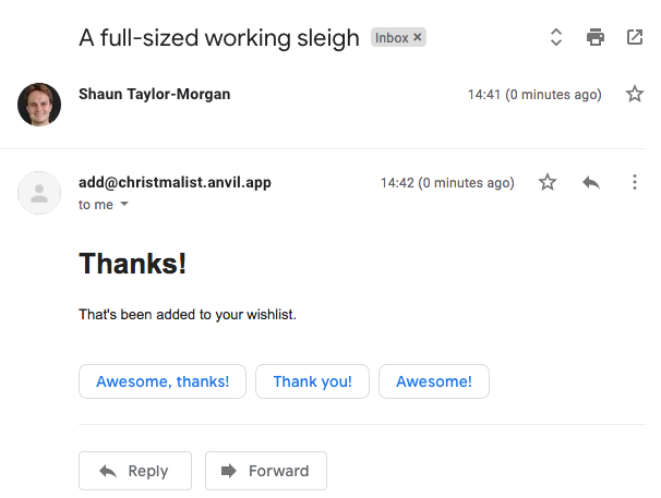 # Messages to add@christmalist.anvil.app go to the 'add item' handler