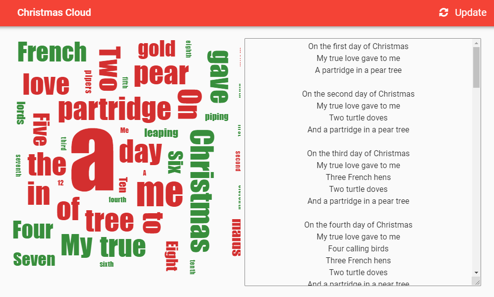 For those of us who can't sing, what do we do while our friends are out carolling? You guessed it - data visualisation! Let's take those carols, and draw some word clouds of the lyrics. We're going to use the D3 visualisation library and the d3-cloud layout to take care of the heavy...Gold, Frankincense and Myrrh