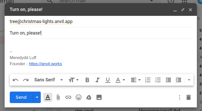 Advent Day 13: Give your Christmas tree an email address! We already have server functions to control the lights, so we just need to add the Email service, and write the following code in a Server...A Command Line Christmas