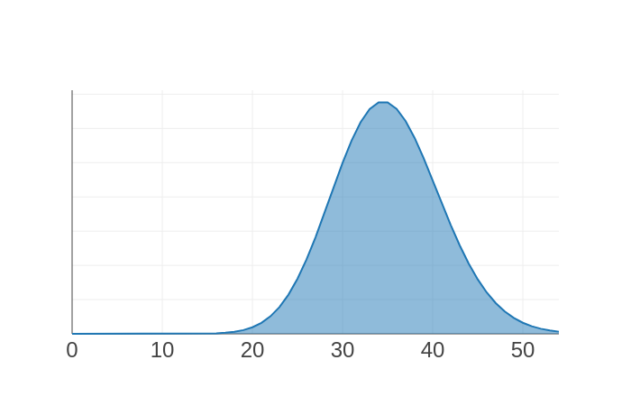 Here I’ve plotted two binomial distributions, using Anvil’s plotting tools. On the left, we’re expecting to give away about 2 shirts, but we could easily need twice that number. On the right, we’re expecting 35, but we’re unlikely to need more than 40 – we’re much more certain with larger numbers. This is the insight we had before – but now we’ve got a model, we can quantify it!