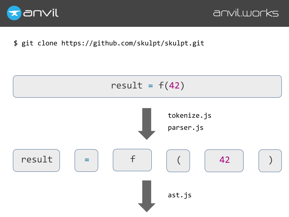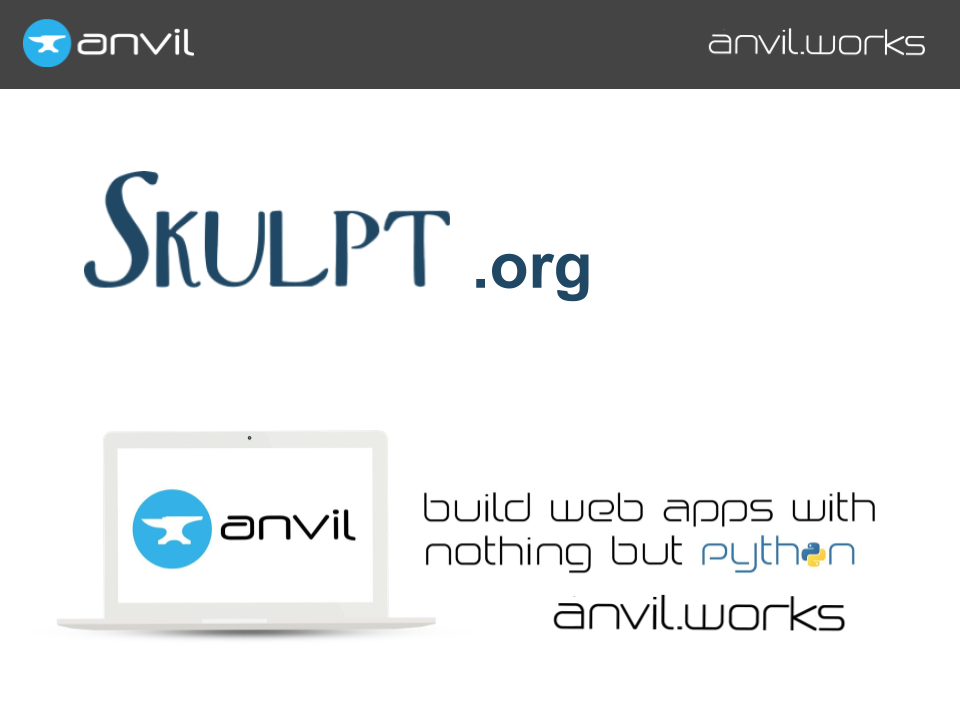 Thankfully, there’s a great open-source project called Skulpt, that compiles Python to Javascript. So you can write Python to drive your app, and we can compile it to Javascript so that when you publish it online, your code actually runs in a user’s browser. We give Skulpt Python objects, it represents them as Javascript objects. We give it a Python function, and it produces a Javascript function for the browser to run.