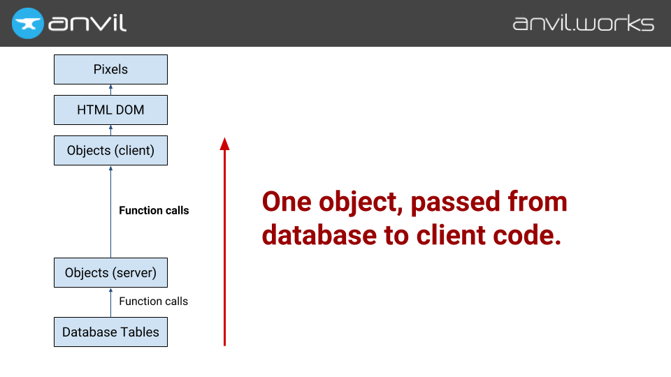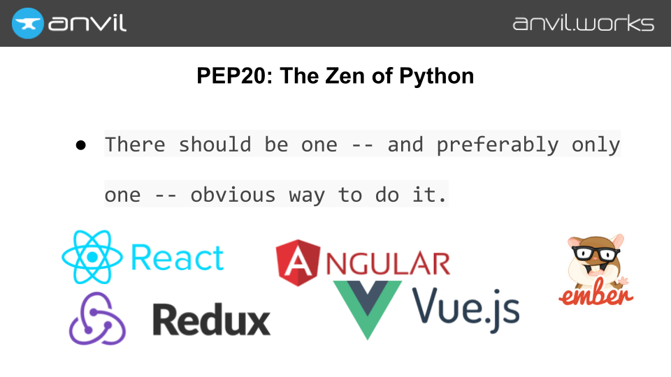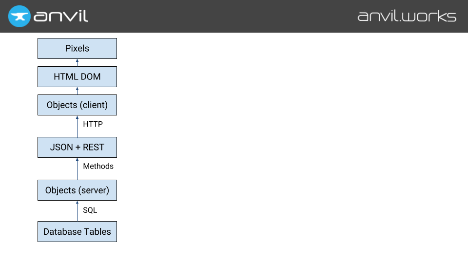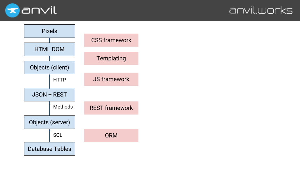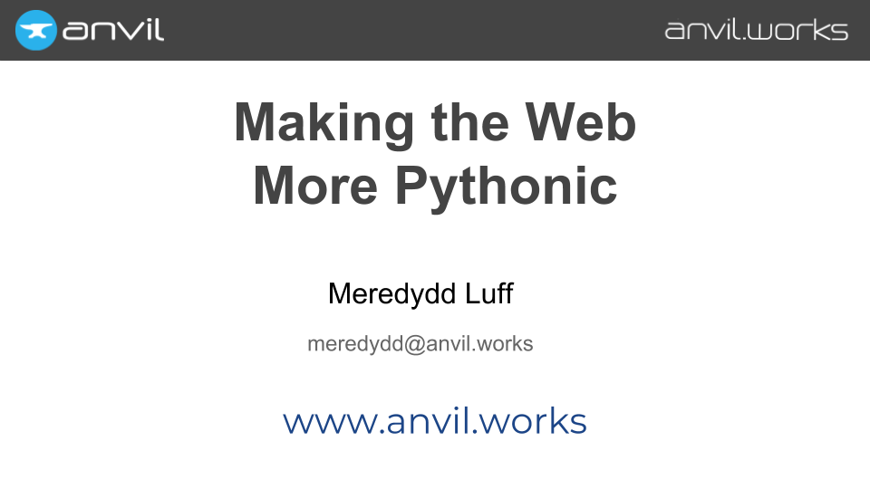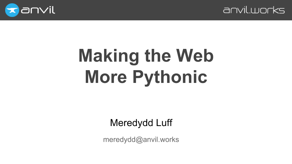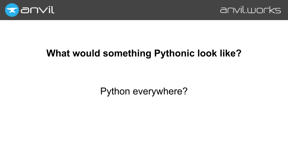 At Anvil, we start by putting Python everywhere — even in the browser. (We use the Skulpt Python-to-Javascript compiler; check out my previous talk about it.)