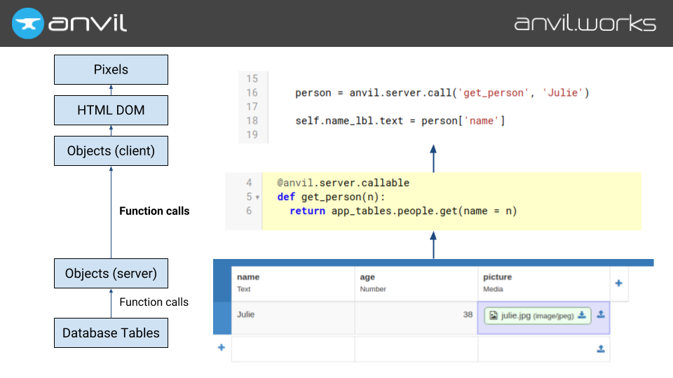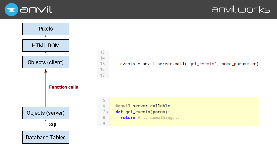 So that’s what we do. Have a function on the server, decorate it with @anvil.server.callable, and call it from the client with a function call.
