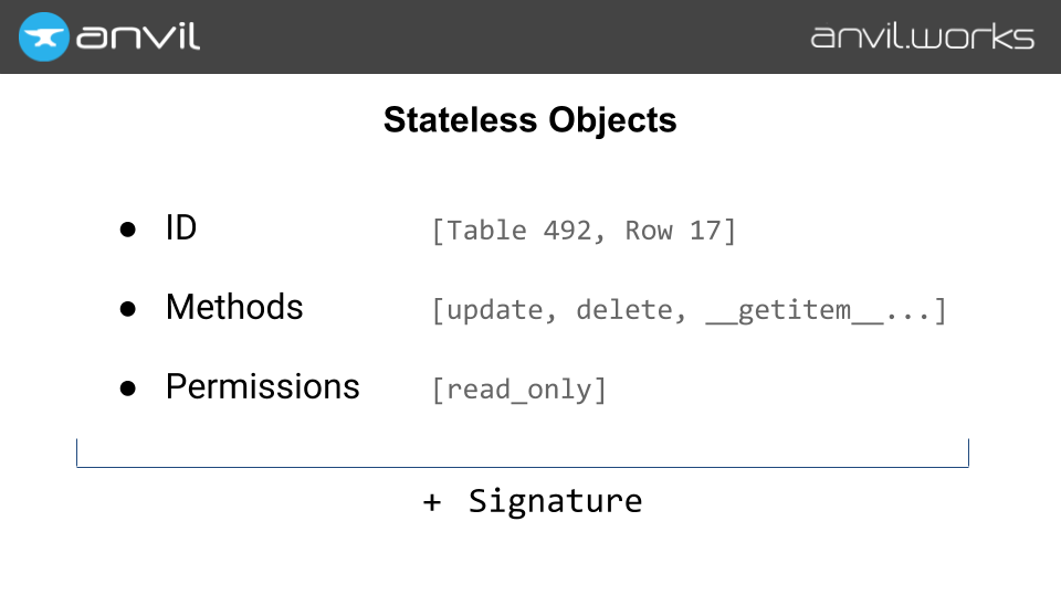 What’s in a stateless object? Well, it has an immutable ID, some method names, and some permissions. That’s all. (So there’s nothing else the server has to remember.)