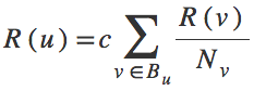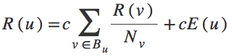where R(u) is the rank of the page we’re ranking, R(v) is the ranking of its backlinks, Nv is the number of links page v contains, and c is a constant we can tweak at will. The sum is over all the backlinks of the page we’re ranking. (If equations aren’t your thing - this equation just re-states what I said above.)