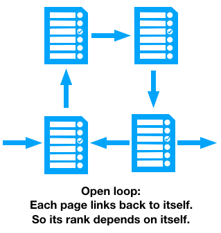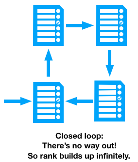 We can’t calculate this all in one go, because pages can link to each other in a loop. If the links between pages form a loop, we don’t know what rank to give them, since they all depend on each other’s rank.