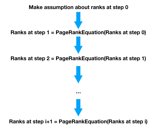 In terms of the equation from earlier, we plug the ranks from iteration i into the right-hand side of the equation, and the ranks for iteration i + 1 come out on the left-hand side.