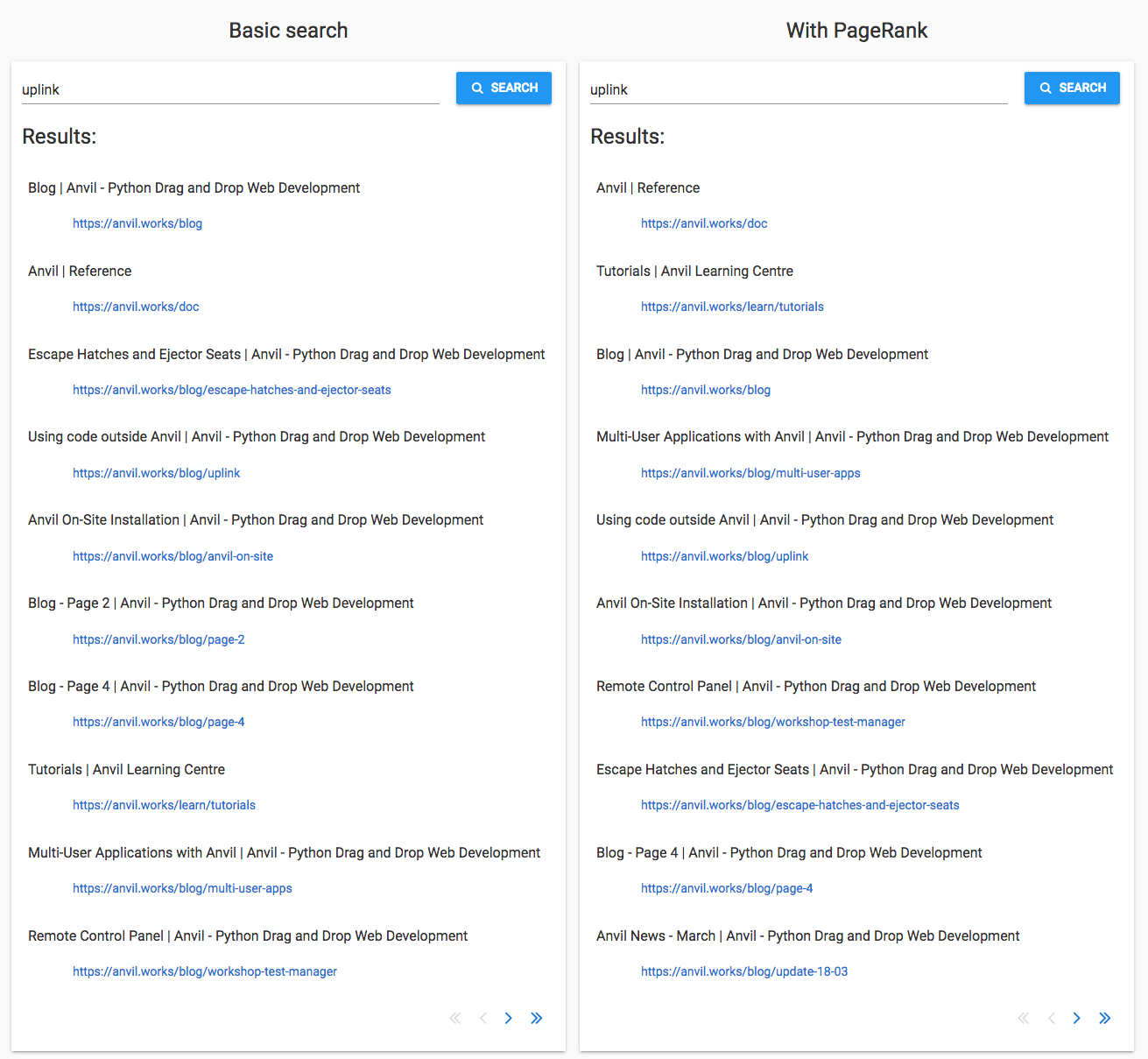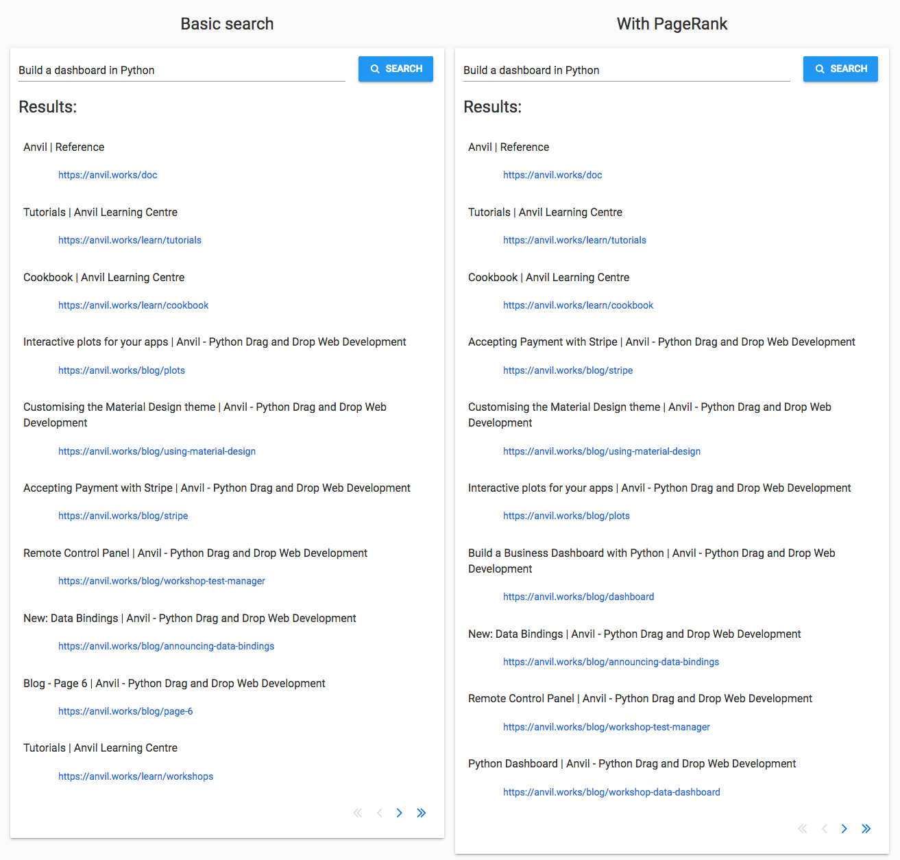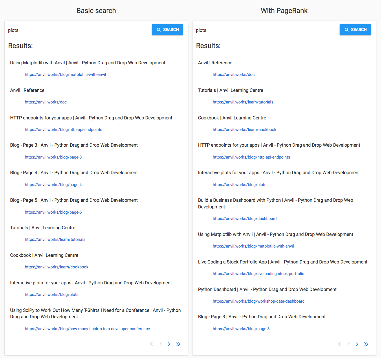 The PageRank search does worse in one respect - the top spot has been taken by the reference docs, replacing the Using Matplotlib with Anvil guide. I’m ranking pages purely based on importance and not on relevance. The reference documentation is clearly ‘more important’ overall than the Matplotlib guide - but not more relevant to a search for ‘plots’.