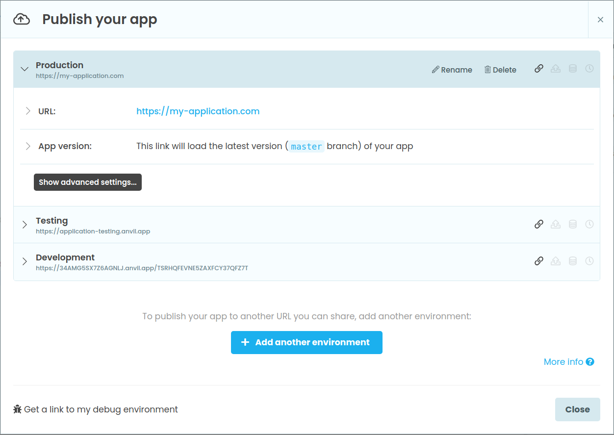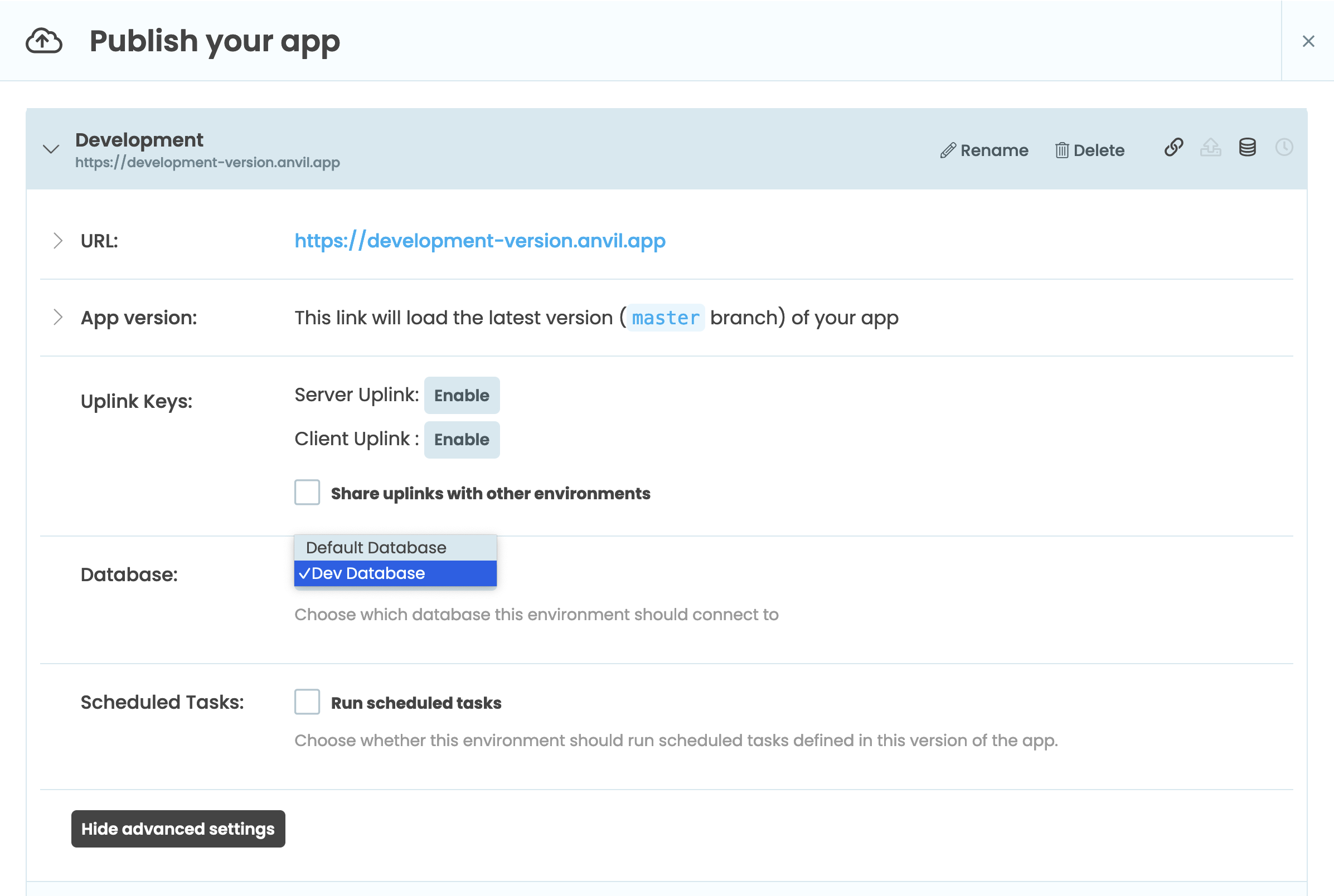 Each Anvil app can have multiple databases. You might want different deployment environments to use different databases – for example, so you can test your app without affecting production data. You can choose which database each environment uses. The tables in this database will be available via anvil.tables.app_tables in this environment.