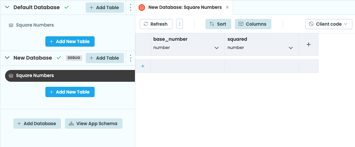 This will create a new database in your app with copies of the data tables from the default database. The data tables in the new database won’t contain any data.