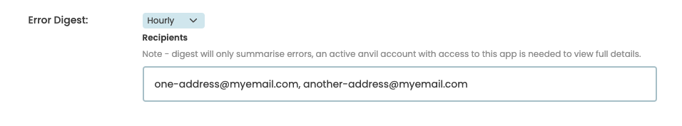 To set up error digests for an environment, click on the dropdown and select the frequency at which you would like to receive emails. You can enter multiple email addresses to send the digest to, separated by commas.