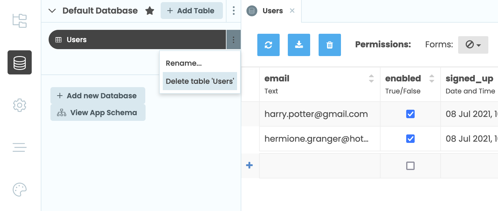 The table of users is created for you automatically when you configure the Users service. Many of the columns are automatically added at the moment they’re first needed.