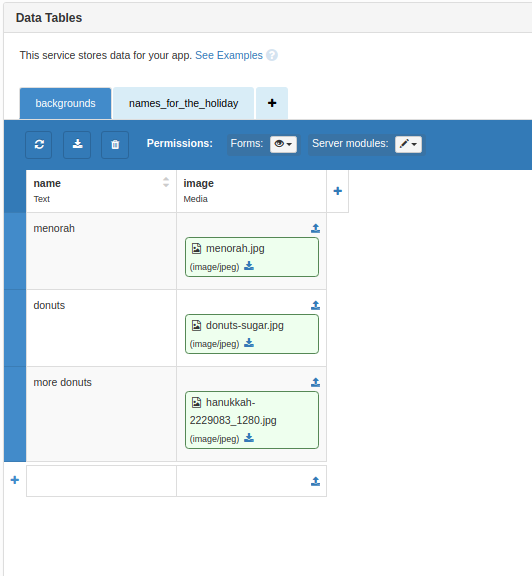 We create a table called ‘backgrounds’ which has a text column for the name of the image and a media column to store the images. I have uploaded three images to my Data Table. It looks like this: