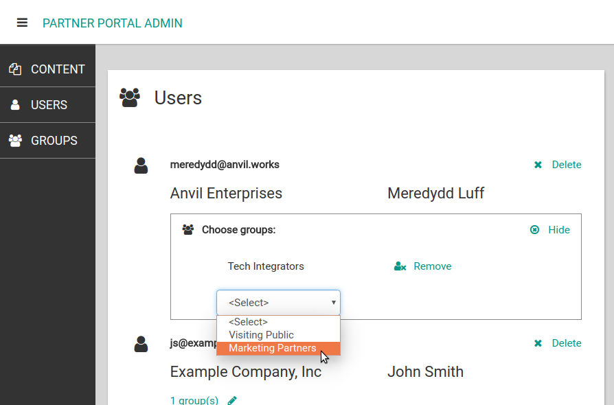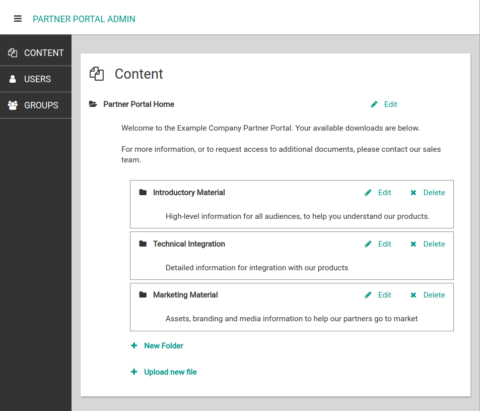 An administration app, which permits the sales team to set which groups a user belongs to, add and remove groups, and add, remove and edit the downloadable files.