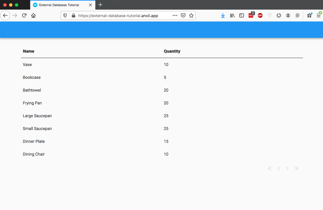 self.repeating_panel_1.items = anvil.server.call('get_items')Now run your app. The data from your external Postgres database will be displayed in the table!