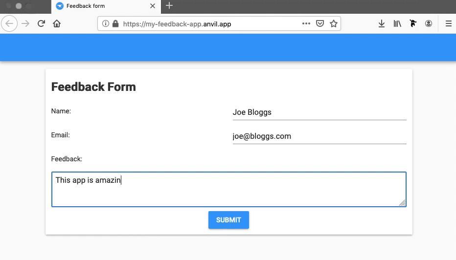 In this tutorial, we’ll take a tour of Anvil and build a simple feedback form. We’ll start from a blank page, and build up to a web app with database storage, email functionality and deployed on the web - all in nothing but Python.
