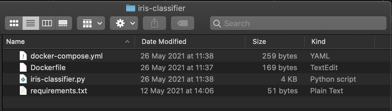 Next, we need to create a file called Dockerfile (with no file extension) in the iris_classifer directory where our Python and requirements.txt files live.